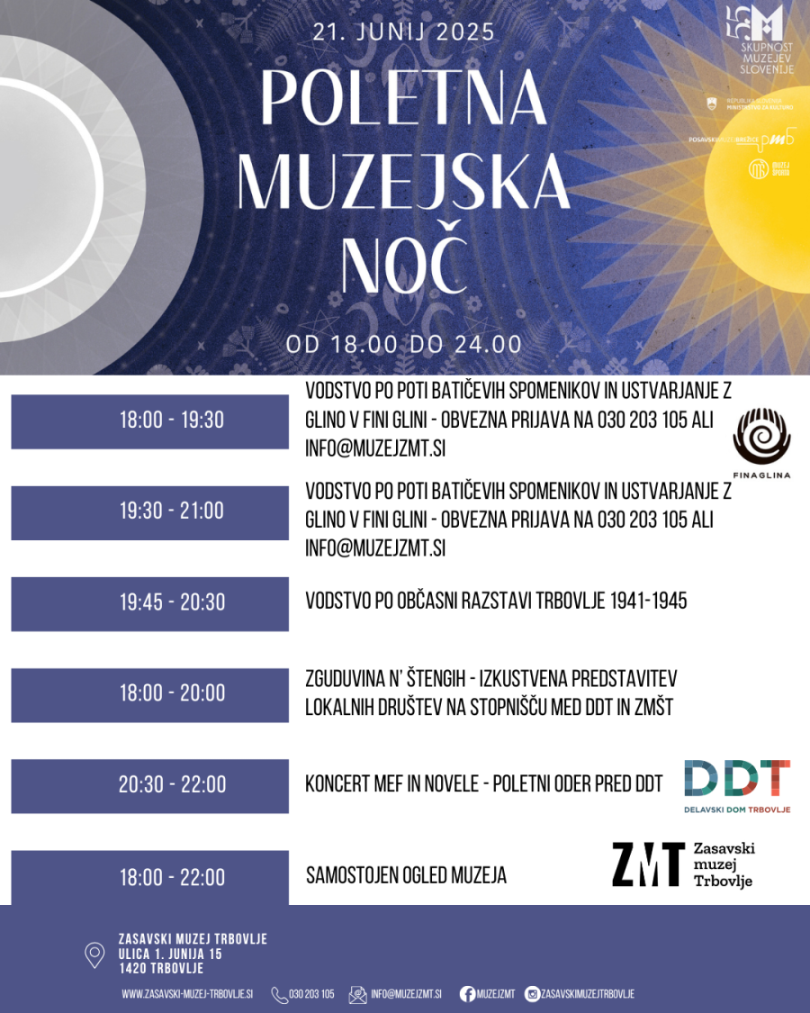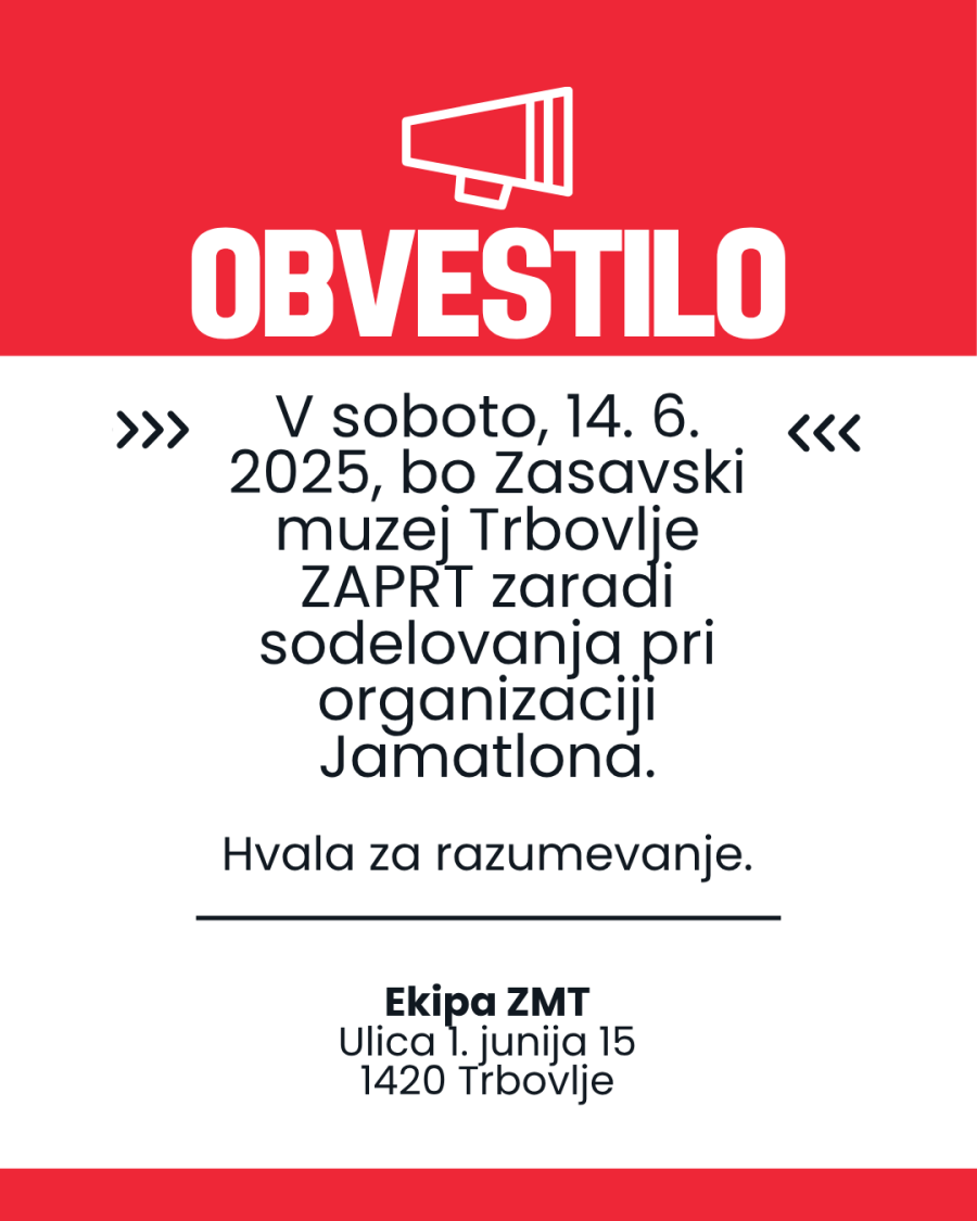 ZASAVSKI MUZEJ TRBOVLJE Ulica 1. junija 15 1420 Trbovlje Ta e-poštni naslov je zaščiten proti smetenju. Potrebujete Javascript za pogled. tel.: 030 203 105