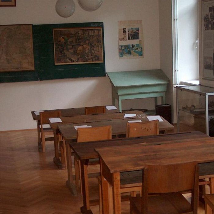 V prvem razstavnem prostoru prvega nadstropja, nekdanjem šolskem razredu, torej in situ, je prikaz razvoja osnovnega šolstva. V razred nas pospremi šolski zvonec, ki je bil nekoč pritrjen na poslopje osnovne šole Čeče; otroke je klical k pouku in oznanjal odmore.